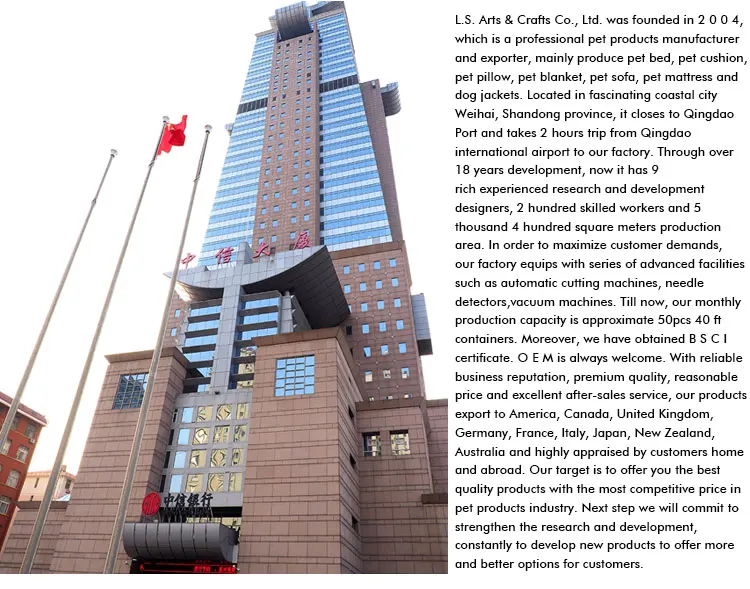 L.S. Arts & Crafts Co.,Ltd is a comprehensive corporation specializing in producing all kinds of pet products like pet beds,pet cushions,pet garments and pet shoes,plush toys,willow baskets and wooden crafts, etc. Our products are mainly sold to America, Europe, Australia,etc. and highly praised by our customers at home and abroad because of excellent quality and service. We warmly welcome all friends from both domestic and abroad to cooperate with us on the basis of mutual benefit and growth!